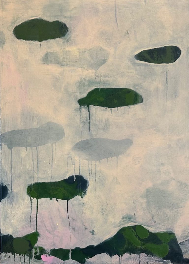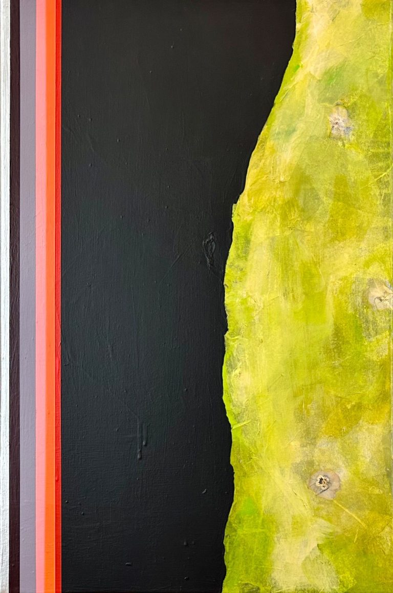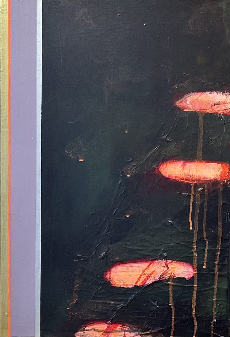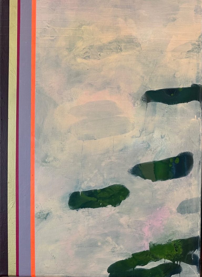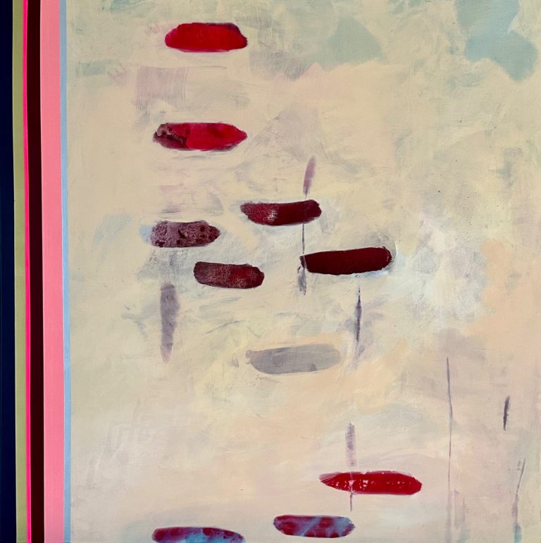 In diesen Arbeiten verbinden sich Bewegung und Farbe. Formen schweben, kippen und verändern den Bildraum, während die vertikalen Referenzstreifen am Rand Orientierung geben. Sie wirken wie ein Koordinatensystem, das Ordnung und Rhythmus schafft. So entsteht eine Spannung zwischen freiem Farbfluss und klarer Struktur.