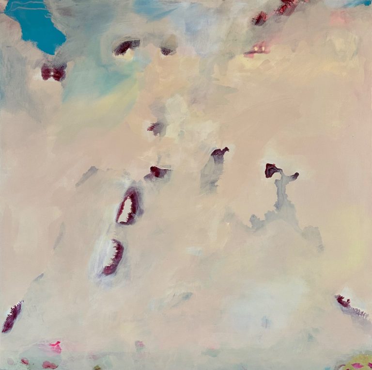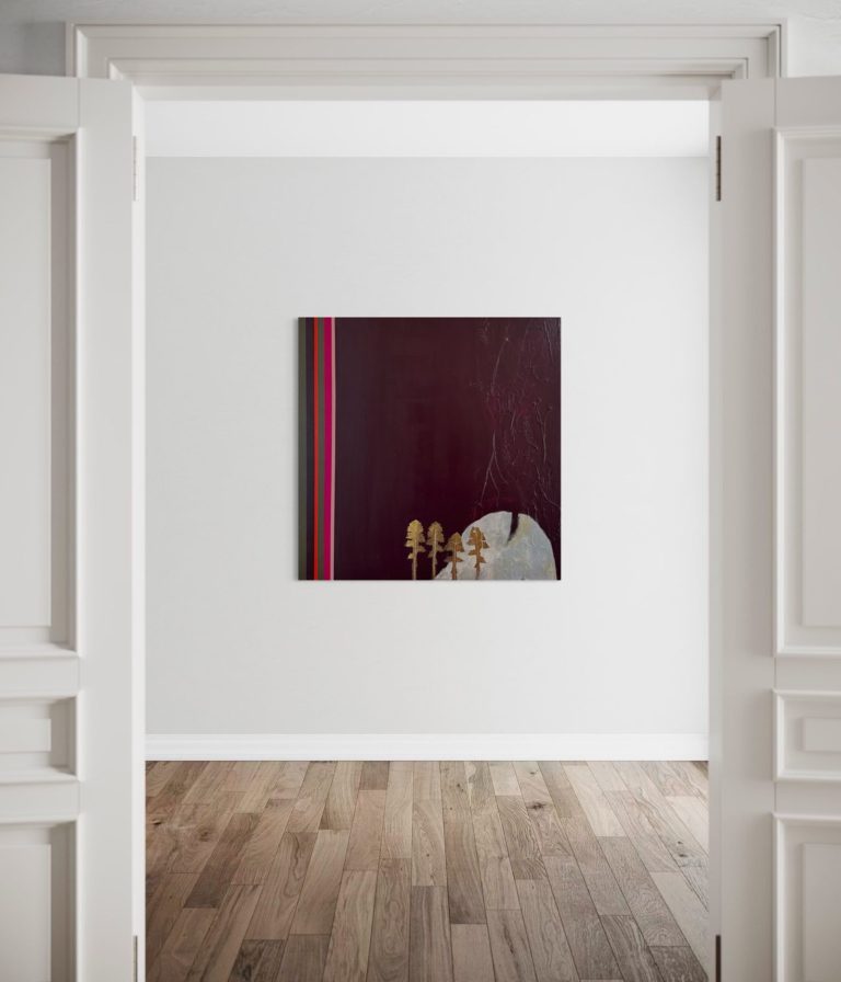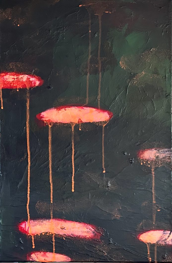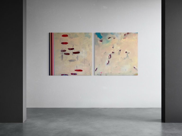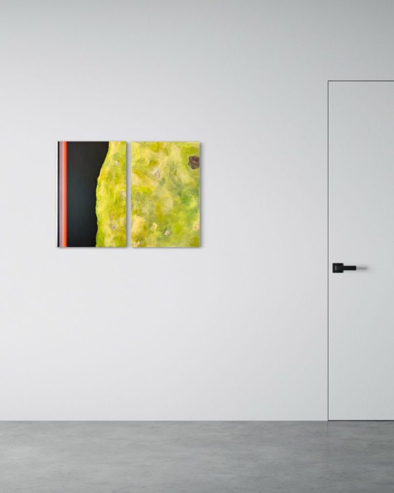 In diesen Arbeiten verbinden sich Bewegung und Farbe. Formen schweben, kippen und verändern den Bildraum, während die vertikalen Referenzstreifen am Rand Orientierung geben. Sie wirken wie ein Koordinatensystem, das Ordnung und Rhythmus schafft. So entsteht eine Spannung zwischen freiem Farbfluss und klarer Struktur.